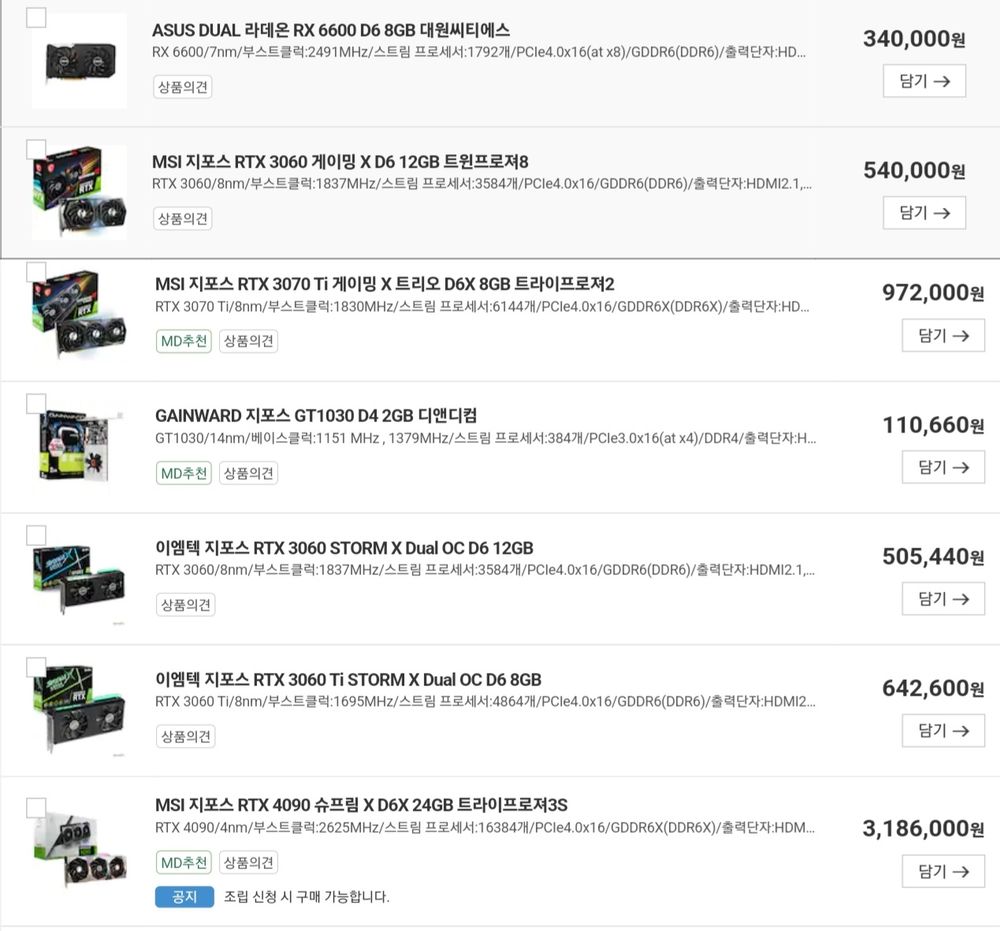 일일 마다 판매처 그래픽 카드 가격 변동있음.