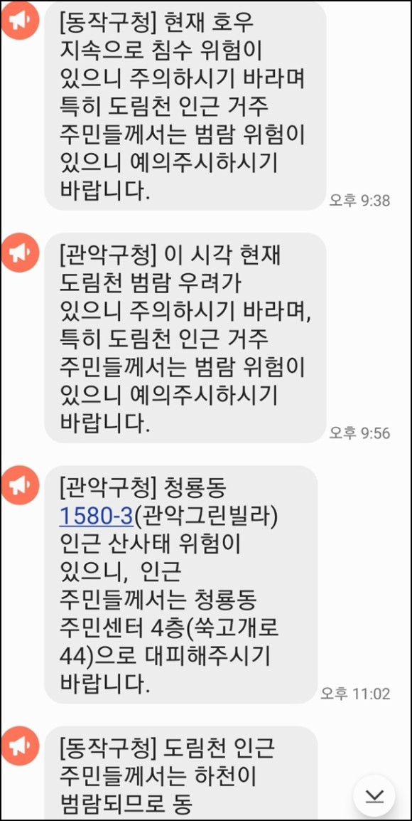 - 개울가, 하천변, 해안가 등 침수 위험지역은 급류에 휩쓸릴 수 있으니 가까이 가지 않습니다.