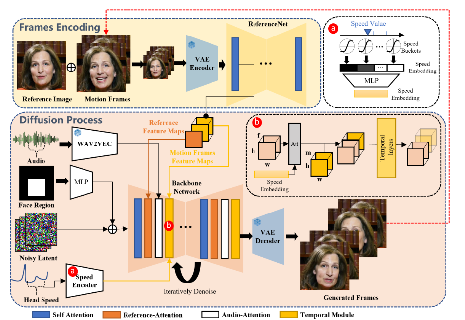 이후 확산 프로세스 단계에서는 사전 훈련된 오디오 인코더가 오디오 임베딩을 처리합니다.