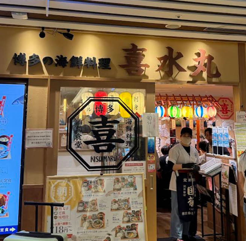하카타역에서 하카타 구치로 들어와서 바로 지하 1층으로 내려오면 ‘하카타 이치 반가이’라는 곳이 나오는데 이곳에는 우동집, 라멘집, 규탄 정식 등 아침식사할 곳이 여러 군데 있으며 키스이마루 이곳에 위치!