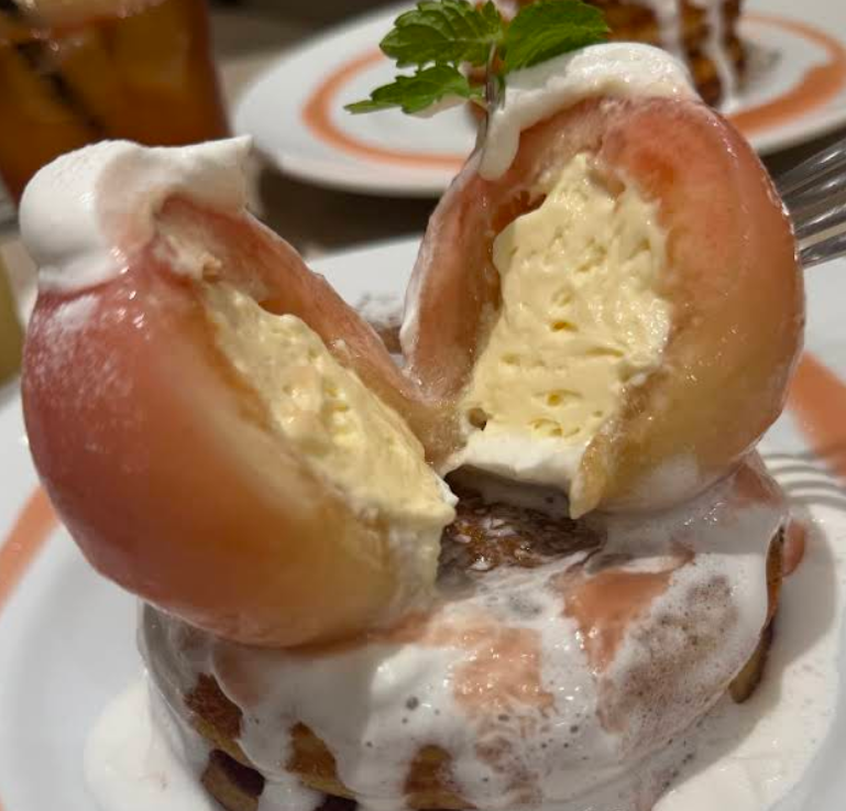 기간 한정의 “마루코 백도 팬케이크”가 너무 빛났다🍑 월요일 밤, 퇴근길에 친구와 방문. 목적은, 기간 한정의 백도 팬케이크! 통째로 1개의 복숭아가 돈과 되어 있어, 임팩트 발군◎ 팬케이크는 촉촉한 떡으로 밀키 크림과 궁합도 최고.