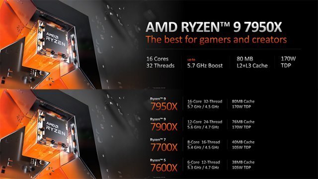 최상위 제품인 라이젠 9 7950X는 16코어, 32스레드로 구성되며 최대 5.7GHz로 작동한다. 이는 인텔 12세대 코어 i9-12900KS 대비 약 200MHz가 높은 것이다. 가격은 699달러(약 95만원)로 전작인 라이젠 9 5950X(799달러, 약 108만원)대비 100달러 가격을 내렸다.
