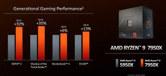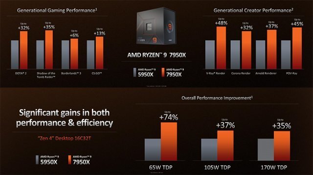 전 세대 최상급 프로세서인 AMD 라이젠 9 5950X와 새로 출시된 AMD 라이젠 9 7950X를 비교한 자료에 따르면, 게임 영역에서 도타 2 32%, 섀도 오브 더 툼레이더 35%, 보더랜드 3 6%, 카운터 스트라이크: 글로벌 오펜시브가 각각 13%씩 프레임처리 성능이 향상됐다. 또 작업 성능에서는 V레이 렌더가 38%, 코로나 렌더 32%, 아널드 렌더러 37%, V-레이가 45%씩 향상됐다. 구체적인 게임 및 작업 성능에 대한 정보는 프로세서 출시일에 맞춰 공개된다.