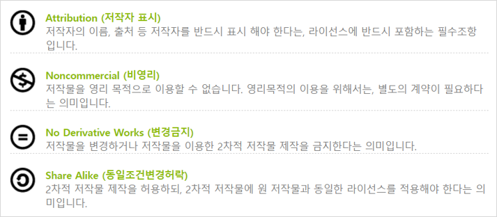 이 저작물에 대한 출처를남기고, 영리적인 목적(=상업적 이용)으로 사용하지 말것이며,