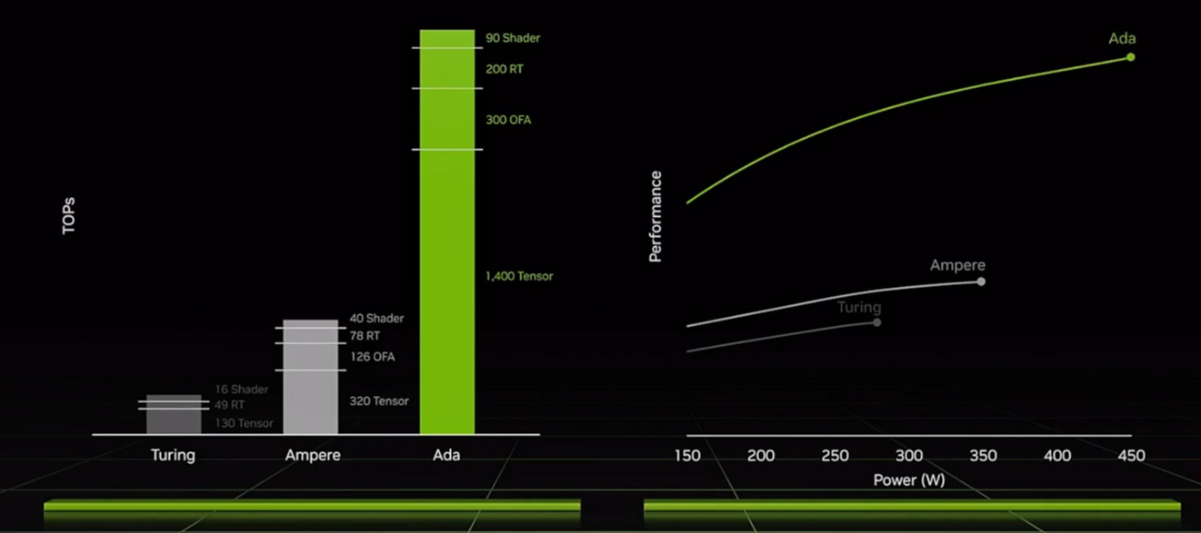 래스터라이즈 게임에서 Ada Lovelace는 Ampere에 비해 최대 2배 빠르며, 레이 트레이싱 게임에서는 무려 4배 더 빠릅니다. 반면 놀라울 정도로 에너지 효율적이기 때문에 Ampere와 비교할 때 같은 소비 전력에서 2배 이상의 성능을 발휘합니다. 한편 Ada Lovelace 아키텍처는 오버클러킹에 친화적으로 NVIDIA의 랩에서는 3GHz 이상으로 Ada Lovelace GPU를 오버클러킹할 수 있었습니다.