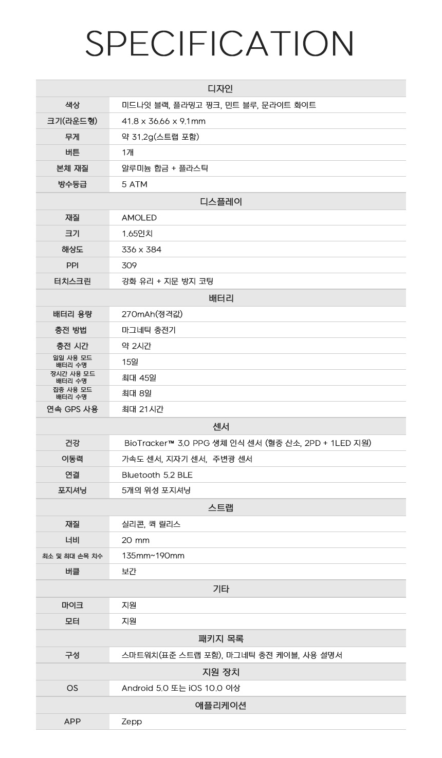 스마트워치 / AMOLED / 336x384 / 4.19cm(1.65인치) / 31.2g / [사양] Zepp OS / [운동] 운동량 / 속도 / 이동거리 / 페이스 / 활동시간 / 보행수 / 걷기 / 달리기 / 날씨 / 일립티컬 / 수영 / 자전거타기 / [건강] 심박수 측정 / 혈중 산소 농도 / 칼로리 / 수면 정보 / 여성 건강 모니터링 / 스트레스 지수 / [연결] GPS / 블루투스 / v5.2 / [배터리] 용량:270mAh / 평균 사용:15일 / [기능] 마이크 / 메세지알림 / 전화알림 / 방수·방진: 5ATM / 색상: 블랙, 핑크, 아이보리, 블루