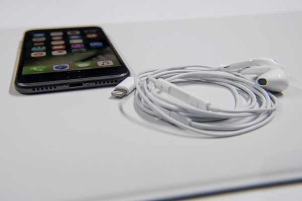 Lightning 포트와 Lightning EarPods가 있는 iPhone 7.